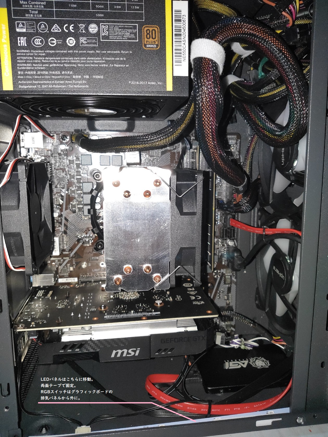 3. グラフィックボード下が暗いから、LEDつけて光らせたい →一応つけてみた。4. サイドフローCPUクーラーのファン問題 →未解決